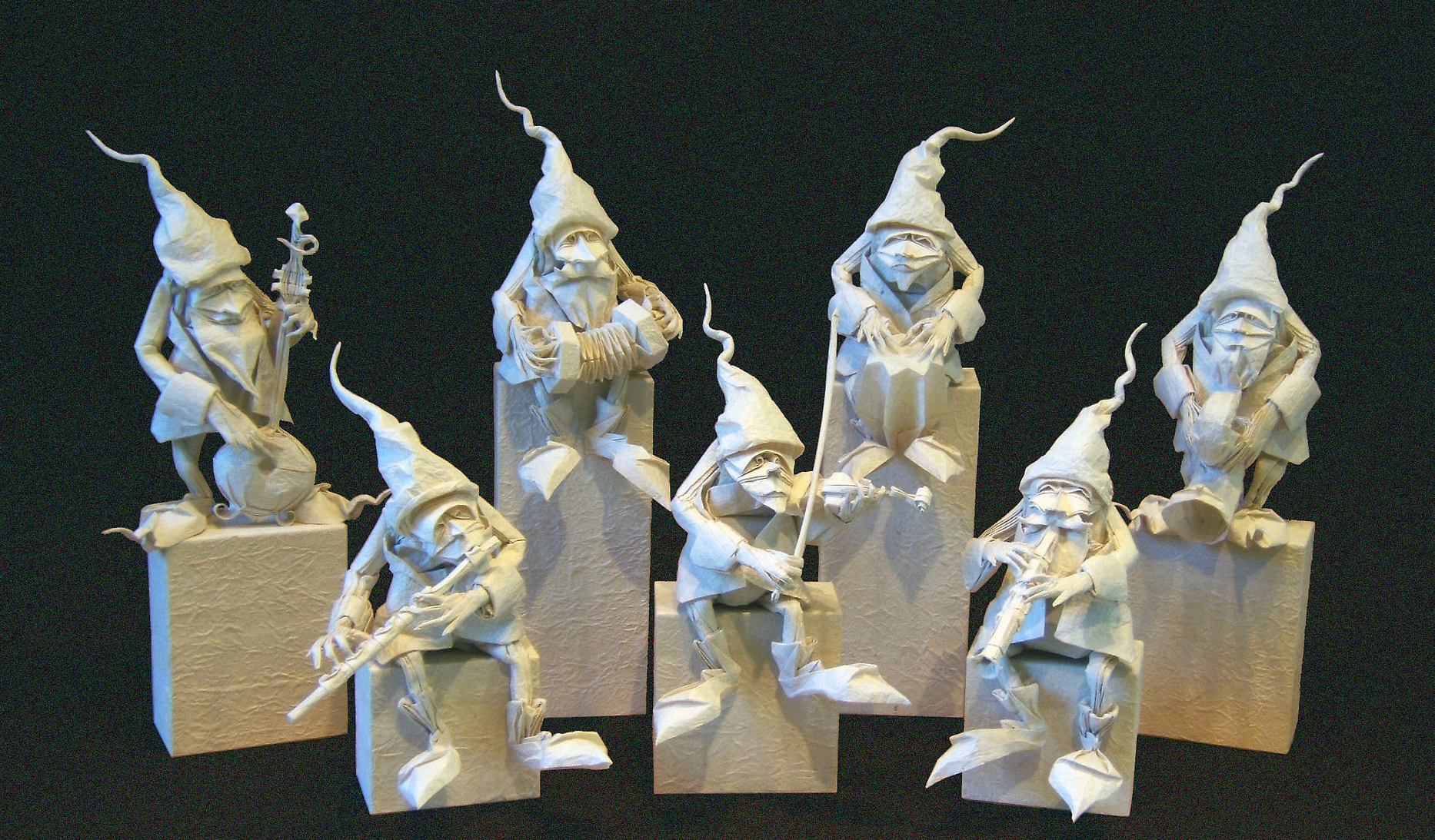 У Ёсидзавы очень много последователей. Один из них, французский любитель оригами Eric Joisel, делал потрясающие работы, используя тот же прием — смачивая бумагу. Многие из его произведений смотрятся удивительно правдоподобно — даже закрадывается сомнение в том, что он использовал всего лишь бумагу. Как, например, в этом «оркестре гномов».