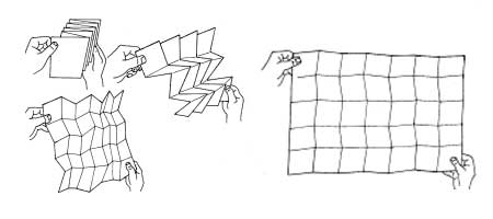 На первый взгляд кажется, что схема пересечений линий сгиба до смешного проста — представляет собой вертикальные и горизонтальные направляющие. Однако если внимательнее присмотреться, можно увидеть, что вертикальные линии не являются идеальными прямыми. Они представляют собой ребра модели, которые на развертке наклонены под углами 84 и 96 градусов. Материал, сложенный по данной развертке, очень легко разворачивается — для этого нужно всего лишь потянуть за два противостоящих угла конструкции. А толщина сложенной модели Миура-ори зависит только от толщины используемого материала.