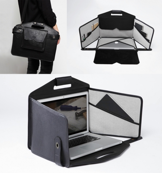 Среди аксессуаров для ноутбуков тоже попадаются удивительные складные модели. Например, кожаный чехол для мобильного ПК под скромным названием La Fonction Item 01. По большому счету, это даже не чехол, это целая сумка для ноутбуков с диагональю в пятнадцать дюймов. Но это не простая сумка, она представляет собой самый настоящий трансформер, который раскладывается в целый мобильный кабинет. В этом «кабинете» есть масса карманов и отделений, в которых можно держать все необходимые вещи — смартфон, блокнот, канцелярские принадлежности, флешки, переходники, внешние жесткие диски — на что только хватит фантазии.
