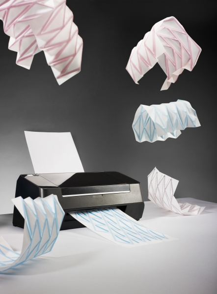 В графическом редакторе он создает топологическую карту линий, по которым должны быть выполнены сгибы, после чего выводит этот рисунок на печать на модифицированном принтере. Бумага, пропитанная водой в соответствующих местах, высыхая, начинает менять свою структуру, стягиваясь там, где легли водные чернила. В результате лист начинает самостоятельно складываться. С ходу трудно сказать, какое практическое применение можно найти для этой технологии, но результат выглядит довольно эффектно.