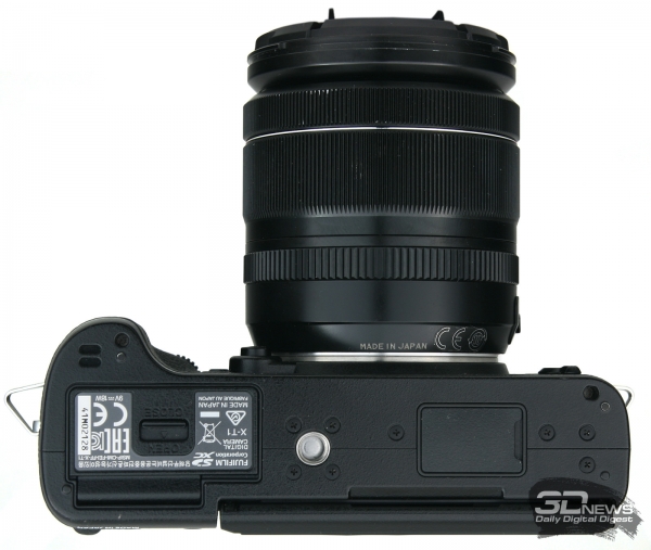 Снизу, помимо привычного отсека для аккумулятора и штативного разъёма, находится порт подключения батарейной ручки, скрытый резиновой заглушкой.