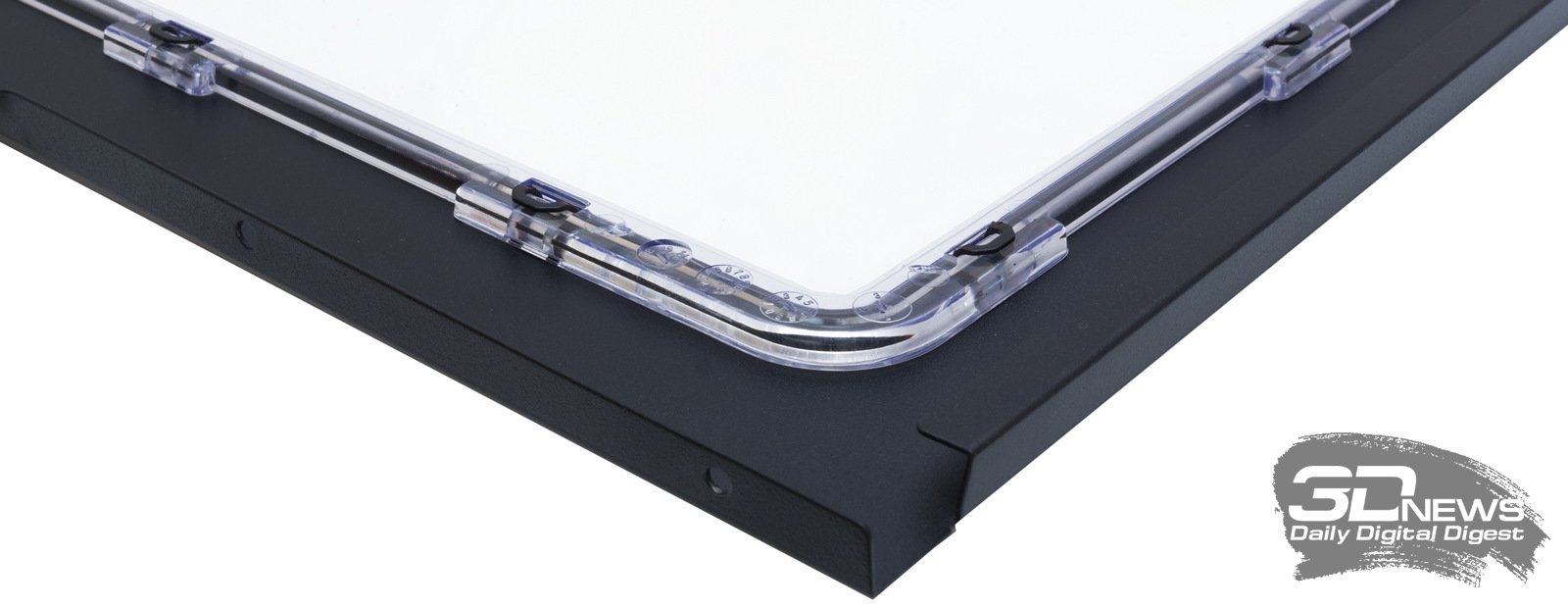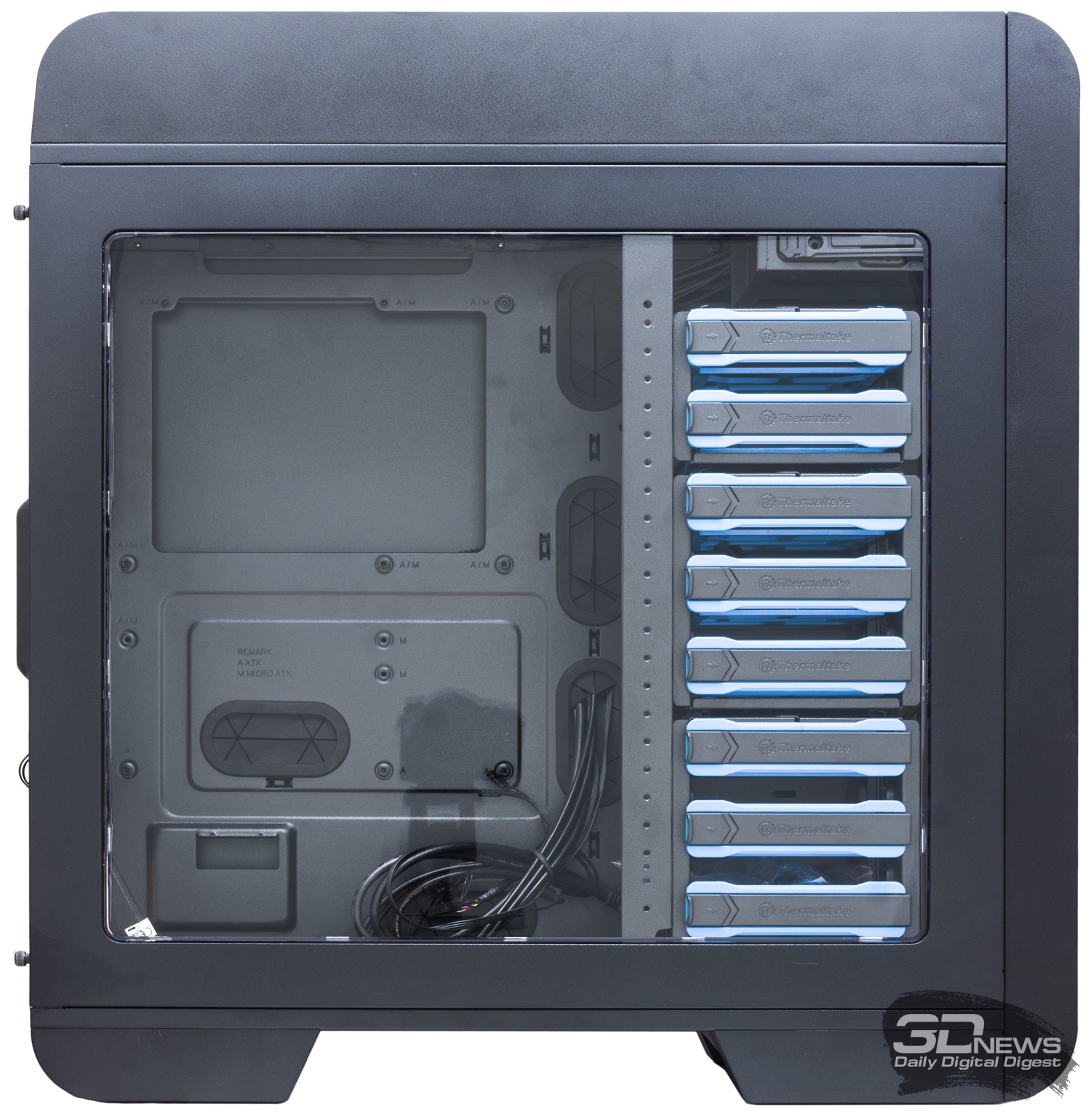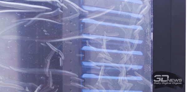 Левая стенка корпуса, как уже говорилось, имеет огромное — размером 435x380 мм — окно. Оно демонстрирует вам и окружающим не только область материнской платы, но и стойку с накопителями. Пластик использован весьма качественный, в идеальных условиях освещения или в темноте он совершенно прозрачен. В реальной же обстановке он имеет тенденцию отражать все, что только возможно.