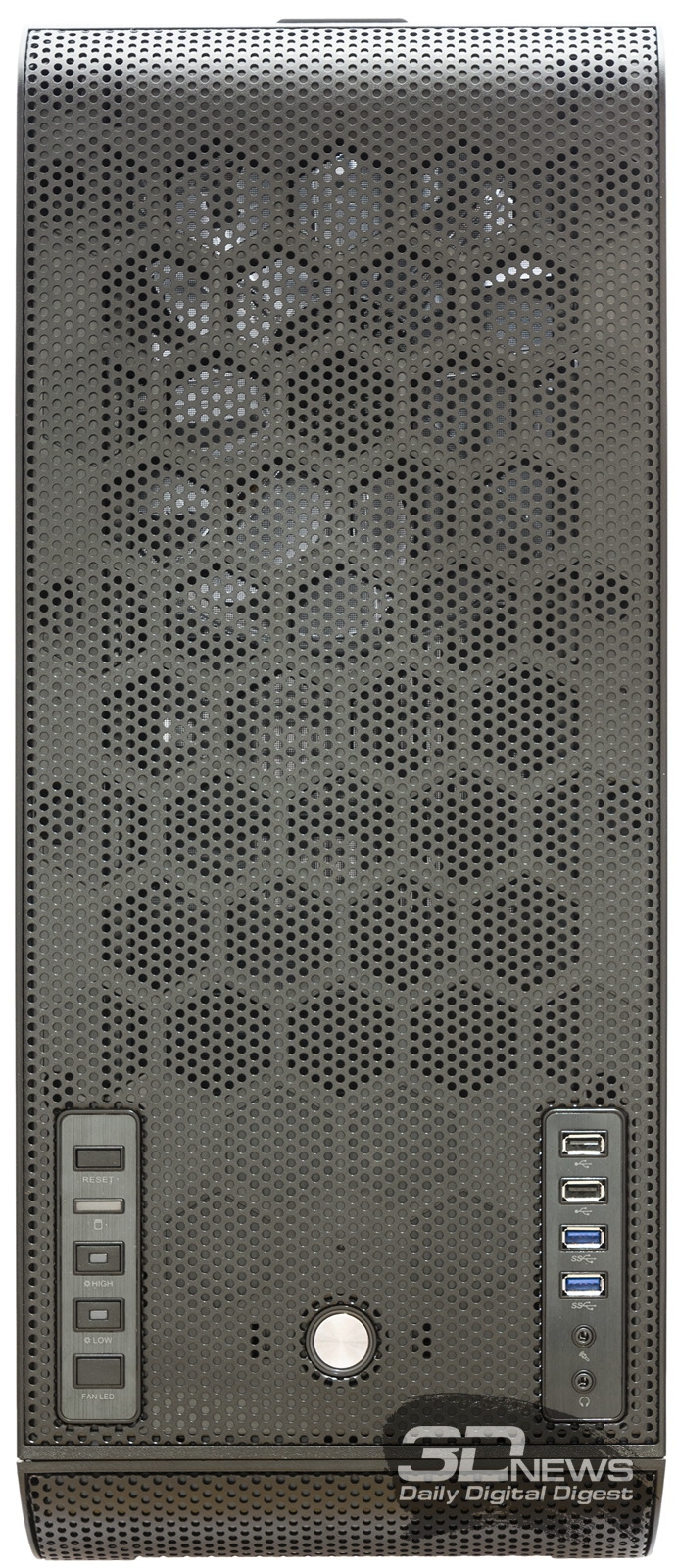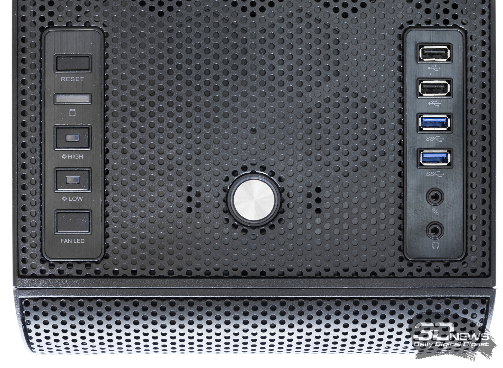 Левый столбец состоит из четырех кнопок и светодиода—индикатора активности накопителей. Сверху вниз представлены: Reset; кнопки выбора высокой и низкой скорости вращения вентиляторов; а также кнопка отключения их подсветки. Последнее — штука, очевидно, полезная, но до невозможности редко встречающаяся на корпусах. Правый столбец содержит по паре USB второй и третьей версий, а также хваткие разъемы для микрофона и наушников.