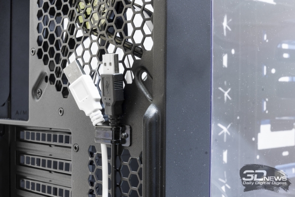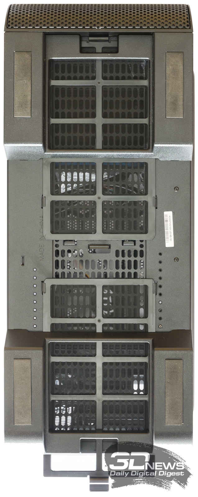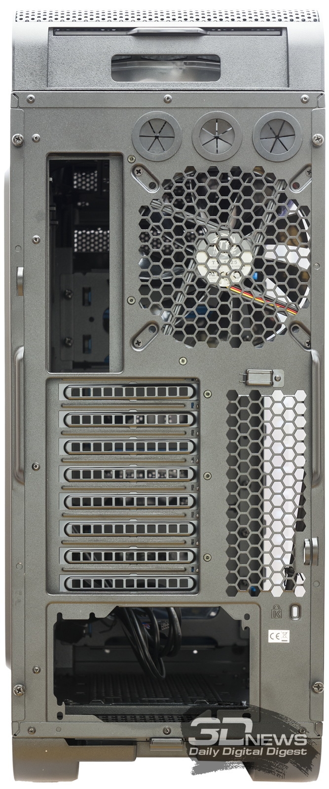 Тыл корпуса, не считая надстройки сверху, практически не отличается от решений конкурентов. Непосредственно под пластиковой крышкой можно обнаружить три отверстия под шланги системы водяного охлаждения диаметром до полудюйма. На стандартном месте установлен вытяжной вентилятор на 140 мм. Под ним — восемь многоразовых заглушек слотов расширения, пронизанных вентиляционными отверстиями. Про вариативность положения блока питания и говорить не нужно. На сладкое — быстрый доступ к верхнему и нижнему противопылевым фильтрам.
