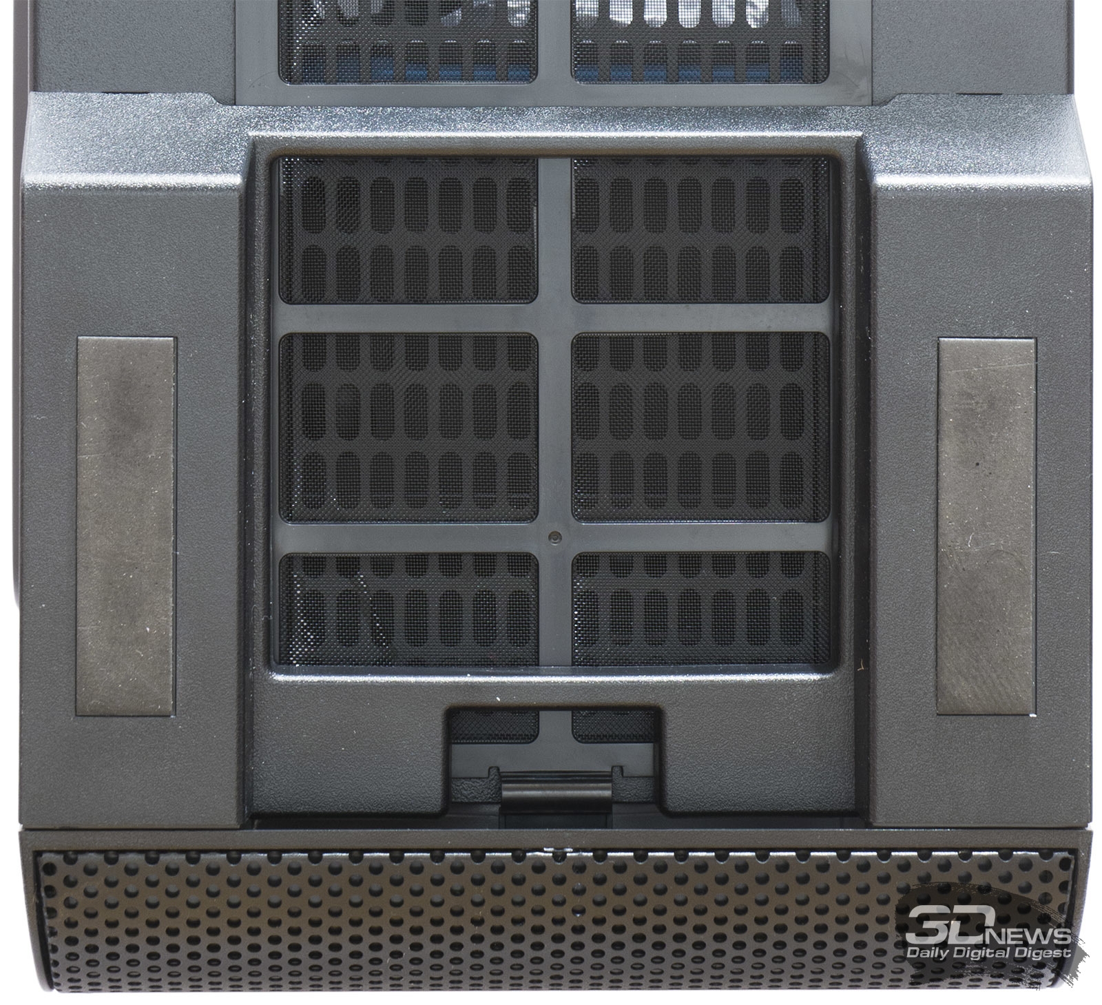 В нашем плане обхода осталась только нижняя сторона корпуса — самое время рассмотреть ее подробнее. Внимание в первую очередь привлекает протянувшаяся от начала до конца вентилируемая зона с перфорацией. Она защищена двумя короткими фильтрами. Тот, что расположен в зоне блока питания, извлекается без лишних манипуляций с корпусом. Мы постарались отразить это на фотографии. Доступ ко второму фильтру открывается только при снятой передней панели. Предполагается, что он будет засоряться значительно реже, поэтому не стоит ради него нарушать целостность дизайна фасада.