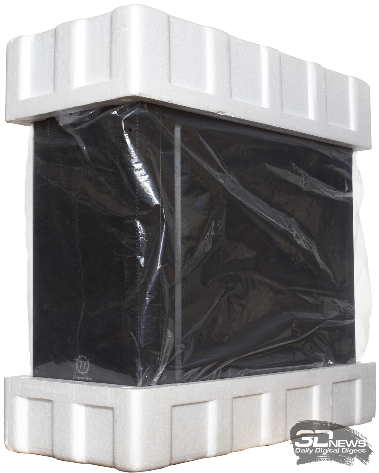 Коробка выполнена из стандартного картона и не обременена полиграфией. Для схематичного изображения корпуса, указания его спецификаций, а также перечисления на двенадцати языках некоторых из его многочисленных достоинств вполне достаточно оказалось лишь черного цвета. Размер упаковки составляет внушительные 64x30x66 см, а вес немного выходит за 15 кг, так что при твердом желании приобрести этого мастодонта заранее обдумайте вопрос транспортировки.