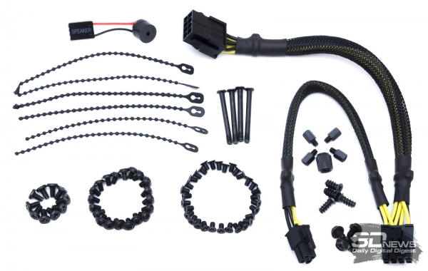 Многоязычная инструкция лежала под одним из пенопластовых демпферов, а оставшаяся часть комплекта обнаружилась в одном из отсеков для накопителей. В Thermaltake не стали разделять детали по категориям и тем более подписывать: просто сложили все, что имеет резьбу, в один пакетик, а все, что обошлось без нее, — в другой. После сортировки перед нами предстали несколько могучих кучек разноцелевых винтиков, небольшой динамик-спикер и шесть стяжек вместо пяти, указанных в комплекте. Количество винтиков точно совпало с заявленным — желающие могут пересчитать самостоятельно. Помимо этих аксессуаров, встречающихся практически в любом комплекте поставки, нас ждал двадцатисантиметровый удлинитель для разъема EATX 12, более известного в миру как дополнительное питание ЦП. Его «двуглавая» конструкция рассчитана в том числе и на платы с четырехконтактным входом — лишний кусок разъема не будет нависать над текстолитом.