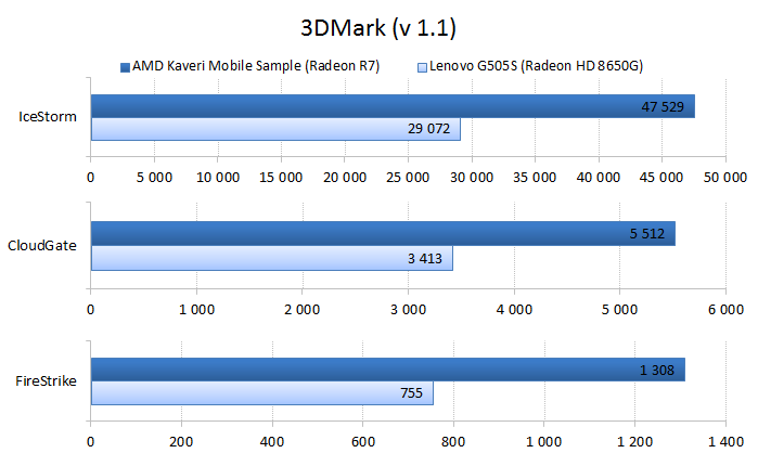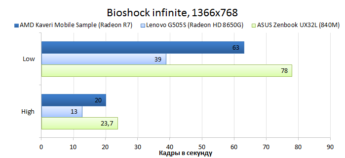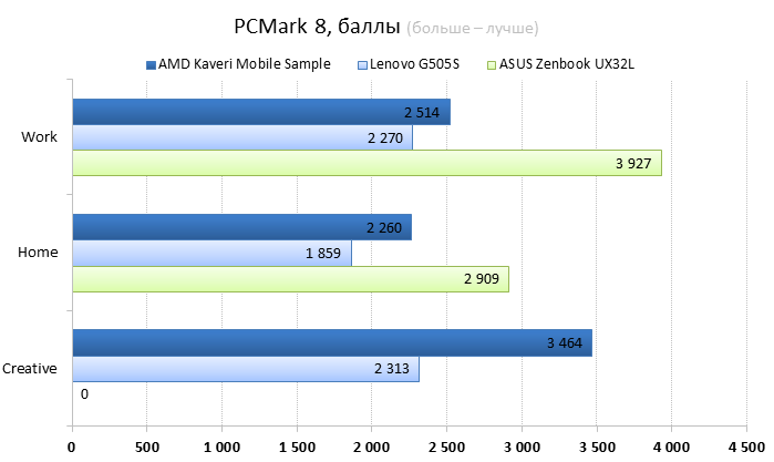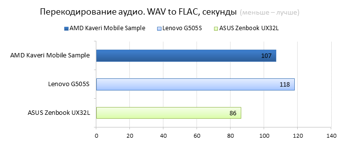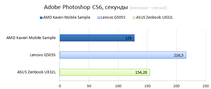 Прежде чем переходить к тестам, давайте вспомним, чем окончилось знакомство с десктопным процессором AMD A10-7850K, самым быстрым из новых APU AMD Kaveri: В целом Kaveri оказался очень неоднозначным продуктом, и мнения о нём могут кардинально различаться в зависимости от того, под каким углом смотреть на новинку. Новый процессор безумно интересен тем, что он развивает концепцию гетерогенных вычислений и внедряет технологию HSA, которая позволяет разработчикам программных продуктов легко перейти к написанию алгоритмов, исполняющихся на вычислительных кластерах графического ядра. Кажется, ещё немного — и AMD добьётся того, что новые приложения будут работать на её процессорах не хуже, чем на CPU компании Intel. Для этого у Kaveri есть все необходимые ресурсы и, самое главное, огромная теоретическая вычислительная мощность, кроющаяся в графическом ядре. Однако не всё так просто. Пока существует не так много даже простых оптимизированных под OpenCL приложений, а эффективность имеющихся реализаций гетерогенных вычислений оставляет желать лучшего. Другое дело — игры. Большинство современных игр может исполняться на A10-7850K в Full HD-разрешении, а многие из них, например популярные сетевые проекты, при этом вполне сносно работают даже при выборе среднего или высокого качества изображения. ⇡#Тестирование процессораНапомним ещё раз, что результаты одного из подтестов, а именно PCMark 8 Creative, были предоставлены компанией AMD по той причине, что его «прогон» занимает около двух часов, а на всё тестирование было отведено всего четыре часа. К сожалению, этот субтест был выполнен с использованием рабочей среды OpenCL, благодаря которой процессору помогал видеоадаптер. Обычно тестовая лаборатория 3DNews не использует данный вариант ускорения вычислений, но в этот раз у нас просто не осталось выбора из-за недостатка времени, отведённого на знакомство с новым мобильным APU. ![]() В однопоточном бенчмарке, оценивающем скорость перекодирования аудиоконтента, процессор AMD FX-7600P оказался немного быстрее своего предшественника и медленнее конкурента от Intel. ![]() В бенчмарке, сделанном на основе Adobe Photoshop CS6, мы видим похожие результаты, хотя здесь стоит внести одно небольшое уточнение. В ноутбуке с новым APU использовался SSD-накопитель, который мог ускорять процесс кеширования при недостатке оперативной памяти. ![]() В тестовом пакете PCMark 8 мы видим превосходство нового AMD FX-7600P над старым AMD A10-5750M во всех трёх тестах. Вот только процессор Intel Core i7-4200U с TDP в 17 Вт оказался быстрее своих конкурентов в подтестах Work и Home. В подтесте Creative этот ЦП не представлен ввиду того, что его надо было проводить с использованием OpenCL, а ультрабука ASUS Zenbook UX32L в тестовой лаборатории уже нет. ![]() В синтетических игровых тестах новый APU показал себя весьма достойно. В синтетическом бенчмарке 3DMark он почти в два раза быстрее своего предшественника во всех трёх тестах. ASUS Zenbook UX32L в этой дисциплине вновь не участвует, потому что на тестовом ноутбуке AMD был установлен 3DMark новой версии, результаты тестов которого несовместимы с нашим 3DMark 1.1. ![]() В игре Bioshock Infinite процессорной графике AMD FX-7600P почти удалось догнать дискретный видеоадаптер NVIDIA GeForce 840M, что очень даже неплохо. При минимальных настройках графики и разрешении 1366х768 процессорное видеоядро AMD Radeon R7 Series смогло преодолеть барьер в 60 FPS, а при максимальных настройках — приб