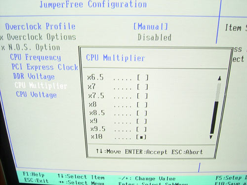 Разгон и стабильностьРассмотрим преобразователь питания. Он имеет 3-х фазную схему, в которой установлены четыре конденсатора емкостью 3300 мкФ, и пять по 1500 мкФ. ![]() Отдельно отметим, что на MOSFET'ах установлен массивный алюминиевый радиатор, который облегчает тепловой режим элементов питания под нагрузкой. Теперь переходим к рассмотрению функций разгона. ![]() Во-первых, плата Asus A8N-SLI позволяет изменять частоту системной шины в диапазоне от 200 до 400Мгерц с шагом 1 Мгерц. Сразу ввести нужное значение нельзя, поэтому приходится перелистывать все промежуточные. ![]() Следующий пункт - функция изменения множителя процессора.