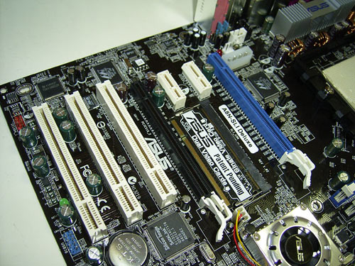 Комплектация платы впечатляет: полный набор кабелей, шлейфов и переходников. ![]() То же самое можно сказать и о брекетах - их 5 штук! Четыре из них стандартные: ![]() А последний предназначен для подключения внешних SerialATA устройств. ![]() Отдельно отметим SLI-коннектор, который предназначен для соединения двух видеокарт: ![]() К руководству пользователя у нас не возникло никаких претензий: все написано четко и понятно. ![]() И наконец в коробке мы обнаружили наклейку с логотипом Asus, наклейку на корпус с расположением коннекторов и перемычек, картинку с изображением видеокарты (ее предназначения я так и не понял :)), а также CD диск с дополнительным программным обеспечением (InterVideo WinDVD Suite: WinDVD5, DVD Copy2, WinDVD Creator и DiscMaster2). Что касается обычного диска с драйверами, то на нем (помимо драйверов для Windows и Linux) можно найти набор фирменных утилит Asus (PC Probe (есть также 64битная версия), AIBooster, Update, MyLogo2 + набор заставок ). Кроме того, на диске записан пакет Norton Internet Security 2005, а также утилита nVidia nTune. В результате, учитывая стоимость платы (более 200$), за комплектацию можно поставить оценку "5". Напомню, что чипсет nForce4 Ultra/SLI поддерживает 10 портов USB 2.0, а с помощью брекетов мы можем подключить только 4 (еще 4 расположены на задней панели). То есть, пользователю необходимо докупить еще один брекет с двумя портами. Плата Asus A8N-SLIНеобходимость установки на плату двух полноразмерных слотов PCI Express несколько усложнило дизайн PCB. В результате при сборке системы возникает проблема с блокировкой защелок слотов DIMM видеокартой, установленной в первый слот PCI Express x16. ![]() Других проблем у сборщика не возникнет: основной 24-пиновый и дополнительный 4-пиновый разъемы питания установлены по краям платы. Также на краях платы расположены все коннекторы для подключения разнообразных брекетов. Кстати, возможная установка двух PCI Express видеокарт привела к повышенным требованиям в области питания. В результате на плате появился дополнительный Molex разъем, который установлен около первого слота PCI Express x16. ![]() Тут же расположены разъемы CD и AUX, а также разъем PWR_FAN для подключения вентилятора. Кроме него, на плате есть еще четыре подобных разъема: CPU_FAN и CHA2_FAN около процессорного сокета (один из них предназначен для процессорного кулера), и CHA1_FAN в левом нижнем углу платы. И наконец трехпиновый разъем CHIP_FAN предназначен для кулера на чипсете. ![]() Поскольку чипсет имеет одночиповую архитектуру, то активное охлаждение положительно скажется на стабильности работы как в штатных режимах, так и при разгоне. Теперь рассмотрим процессорный сокет. ![]() С лицевой стороны установлена стандартная пластиковая рамка, а с обратной стороны платы - усилительная пластина. ![]() На плате установлено четыре слота DIMM, при этом максимальный объем памяти составляет 4Gb. ![]() Слоты памяти разбиты на две группы. Первая группа относится к первому каналу, вторая - ко второму; для облегчения установки модулей соответствующие слоты по разному окрашены. И как только на плату (соответственно на модули DIMM) подается питание, то загорается зеленый светодиод SB_PWR, который установлен около слота PCI3. Что касается возможностей расширения, то, как мы уже говорили, плата имеет два слота PCI Express x16 (оба с фиксаторами), ![]() Между ними расположен специальный SLI-терминатор: небольшая платка, с помощью которой осуществляется переключение между одиночным и SLI режимом