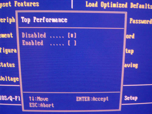 Естественно, в биосе присутствует параметр Top Perfomance, включение которого в некоторых случаях дает небольшую прибавку производительности, а в других случаях приводит к нестабильной работе.