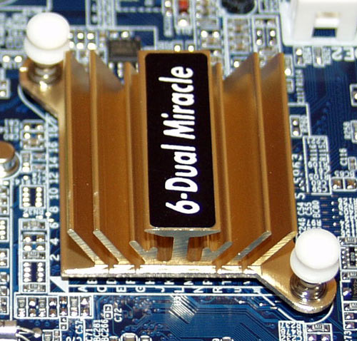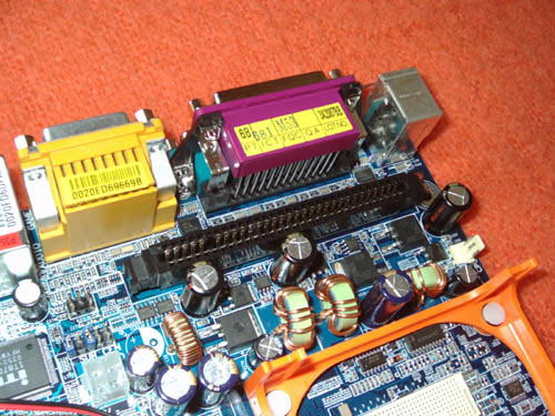 А рядом установлен специальный слот VRM_CONN, который чем-то похож на ISA слот. В него устанавливается модуль DPS, на котором установлено два конденсатора емкостью 3300 мкФ, два - по 1500 мкФ и три - по 1000мкФ. Причем, его конструкция полностью совпадает с конструкцией модуля DPS от плат Gigabyte 8INXP.