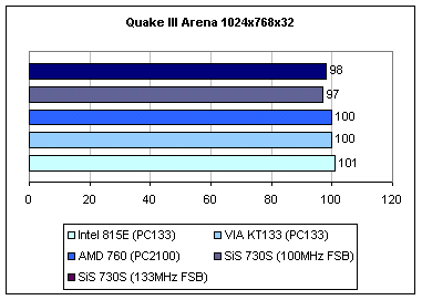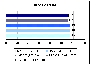 В этом тесте 730S с интегрированным SiS 300 оказался на 7% медленнее KT133 с TNT2 M64 и на 11% быстрее i815E.