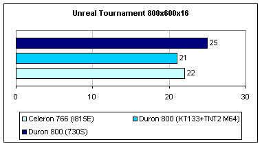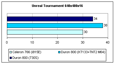 В Unreal Tournament используются очень большие массивы текстур, превышающие объем памяти у TNT2 M64, поэтому приходится прибегнуть к AGP текстурированию, из-за чего сильно падает производительность. Только из-за этого 730S отстает всего на 11%, обойдя i815E.