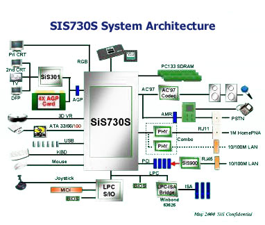 SiS 730S стал исключением, он представляет собой одночиповое решение. Это не значит, что 730S не имеет северного и южного моста, соединенных через шину PCI, это значит, что северный и южный мост содержатся в одном 672-пиновом чипе 730S.