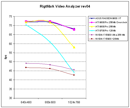 Мы попытались эмулировать работу RADEON 9800 XT, разогнав 9800Pro до частот 9800XT. На графиках эта карта называется "ATI 9800Pro 256Mb Overclock". Разница в результатах как раз и позволит оценить выигрыш от использования системы динамического разгона, впервые реализованной в продукте ATI и улучшенной подсистемы памяти.