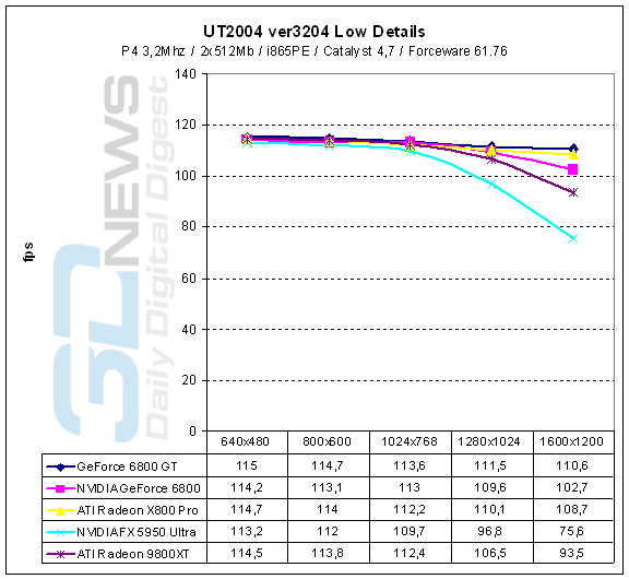 Тестирование A400 TDH (GeForce 6800) и A400GT TDH (GeForce 6800GT)![]() Как видим, Radeon X800Pro, с точки зрения 3DMark2003, находится ровно между GeForce 6800GT и GeForce 6800. ![]() ![]() ![]() ![]() ![]() ![]() ![]() ![]() ![]() ![]() ![]() ![]() ![]() Мы не зря даем вам подробную раскладку FPS по каждому тесту. Отсюда становится понятно, благодаря чему складывается тот или иной результат на каждой из карт. ![]() В тесте на эффективность отсечения невидимых поверхностей, зеленые традиционно выигрывают. Результаты синтетики легко предсказуемы. Гораздо интереснее, что покажут нам карты в игровых приложениях. Тесты: Игровые приложения![]() Первый тест - и первое разочарование. 6800 проигрывает здесь даже 9800ХТ - high - end’у предыдущего поколения. 6800GT же, напротив, показывает себя вполне адекватно, подбираясь вплотную к лидеру Х800 PRO. ![]() 6800 практически приблизилась к своему основному сопернику. Ну а 6800GT уходит в полный отрыв от соперников. ![]() ![]() Весьма забавно бывает наблюдать такую "лесенку".У 6800nonUltra и X800 PRO - практически паритет. 6800GT, as usual, "впереди планеты всей". ![]() ![]() ![]() А в UT2k3 мы наблюдаем совершенно безрадостную для 6800 non Ultra картину. Если в разрешениях 640х480 и 800х600 она еще может составить конкуренцию Х800 PRO, то на 1024х768 и выше налицо очень сильный упадок. Дело в том, что наша Ledtek 6800 единственная карта в этом списке у которой 128Mb, у всех остальных - 256Mb. И вот налицо картина, когда при включении агрессивных настроек качества - этого размера памяти не хватает, начиная с разрешения 1280x1024. Картина повторяется для всех трех демок. ![]() В HALO 6800 поправляет свои позиции. ![]() В Far Cry 6800GT с увеличением используемого при тестировании разрешения все более удаляется от Х800PRO. Но это всё снято на максимальных настройках детализации - все же на стенде стоят карты hi-end уровня. А если все сбросить на минимум, то получится очень смешной график ;-) ![]() Карты уровня 6800 и X800 - вообще не замечают повышения разрешения, а предыдущий hi-end дрогнул только под конец. Подобные тесты характеризуют только "чистую" производительность системы и потолок движка игры. Результаты по GT не влючены - они совпадают с non ultra. На UT2004 еще раз проиллюстрируем тот факт, что современные карты слишком хороши для игр предыдущего поколения. Что включай высокую детализацию, что не включай - все едино. ![]() ![]() И только добавив к высокой детализации еще и "агрессивное качество" в драйверах, можно получить хоть какой-то реальный расклад: ![]() На низких разрешениях - примерный паритет между 6800 non Ultra и X800 PRO, а при тестировании с использованием 4хАА/8хAF Radeon 9800ХТ совсем чуть-чуть обходит своих куда более грозных соперников. С увеличением используемого разрешения растет и разрыв между non Ultra и PRO, а 6800GT прекрасно "держит планку" во всех разрешениях. Конечно же, вы прекрасно понимаете, что реально и серьезно мы сравниваем лишь эти три карты как стоящие друг против друга в таблице позиционирования решений по секторам. Возможно, когда выйдут новые карты линеек NV4х и R4хх, "расстановка сил" поменяется, но не думаю, чтобы очень кардинально. PCI-E будет завоевывать все новые и новые "территории", и на фоне таких крупномасштабных захватнических планов "тихий омут" AGP-рынка воспринимается уже не так. Тесты в финальной версии "Doom 3" бесуловно волнуют всех. Мы сняли их в режиме High Quality (Ultra Quality - это для карт будущего поколения с памятью 512Mb): ![]() Ну что сказать? Кто платит, тот и заказывает музыку, нисколько не удивлюсь если в "Half-Life 2"